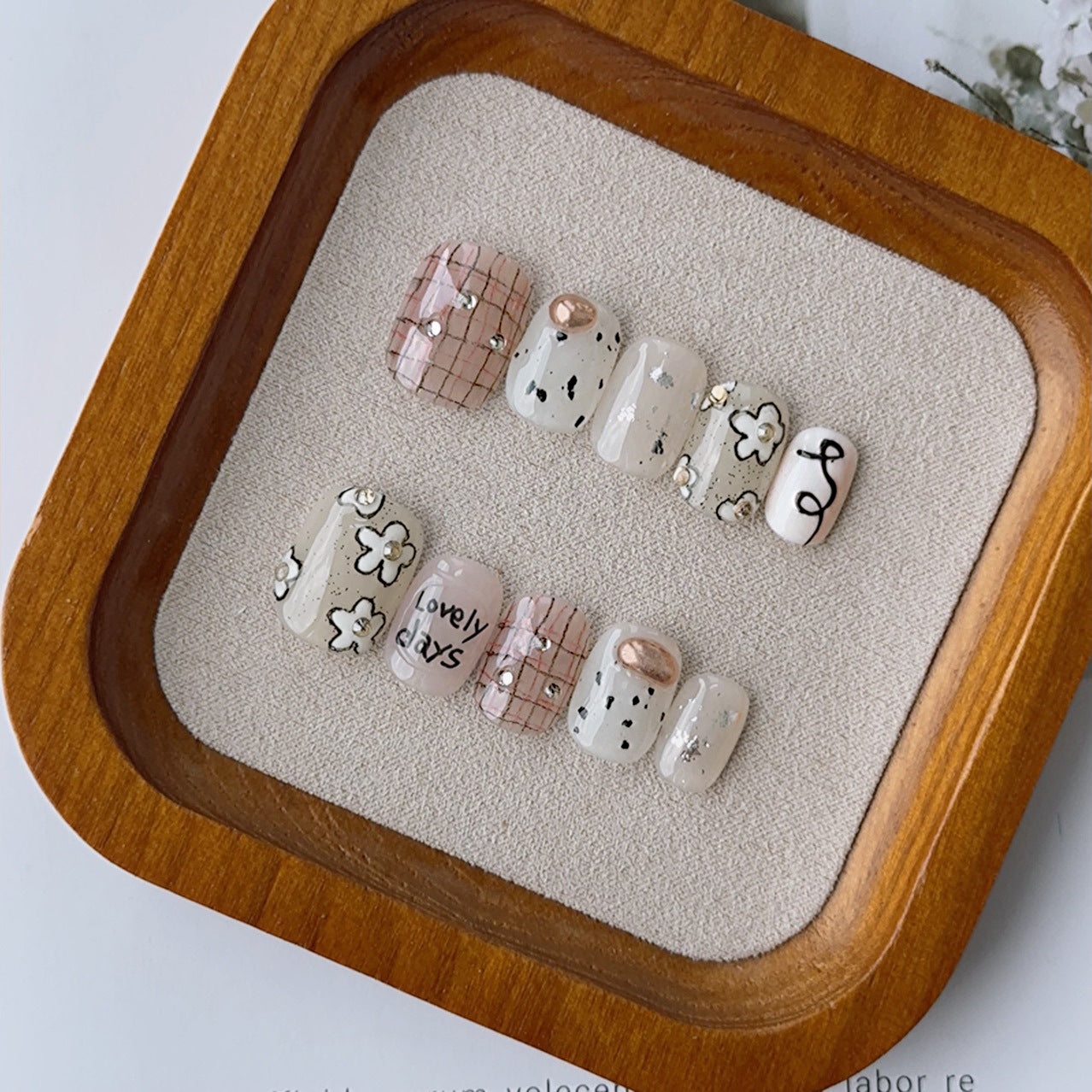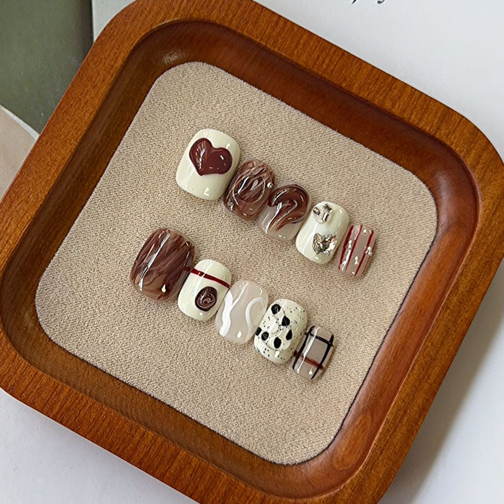 Cute Heart Plaid Flower 3D Short Square & Round Handmade Press On Nails Detachable False Nails